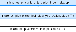 Inheritance diagram for micro_os_plus::micro_test_plus::to_t< T >:Public Types | |